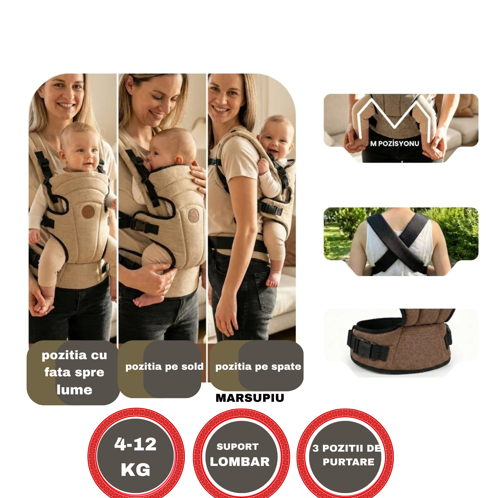 Poziție de purtare a bebelușului care oferă mai mult confort atât pentru tine, cât și pentru bebelușul tău.
