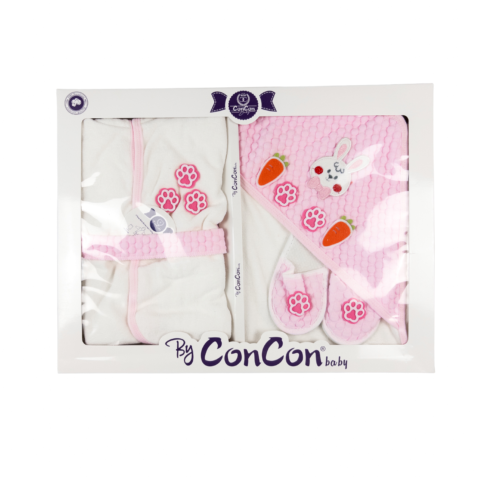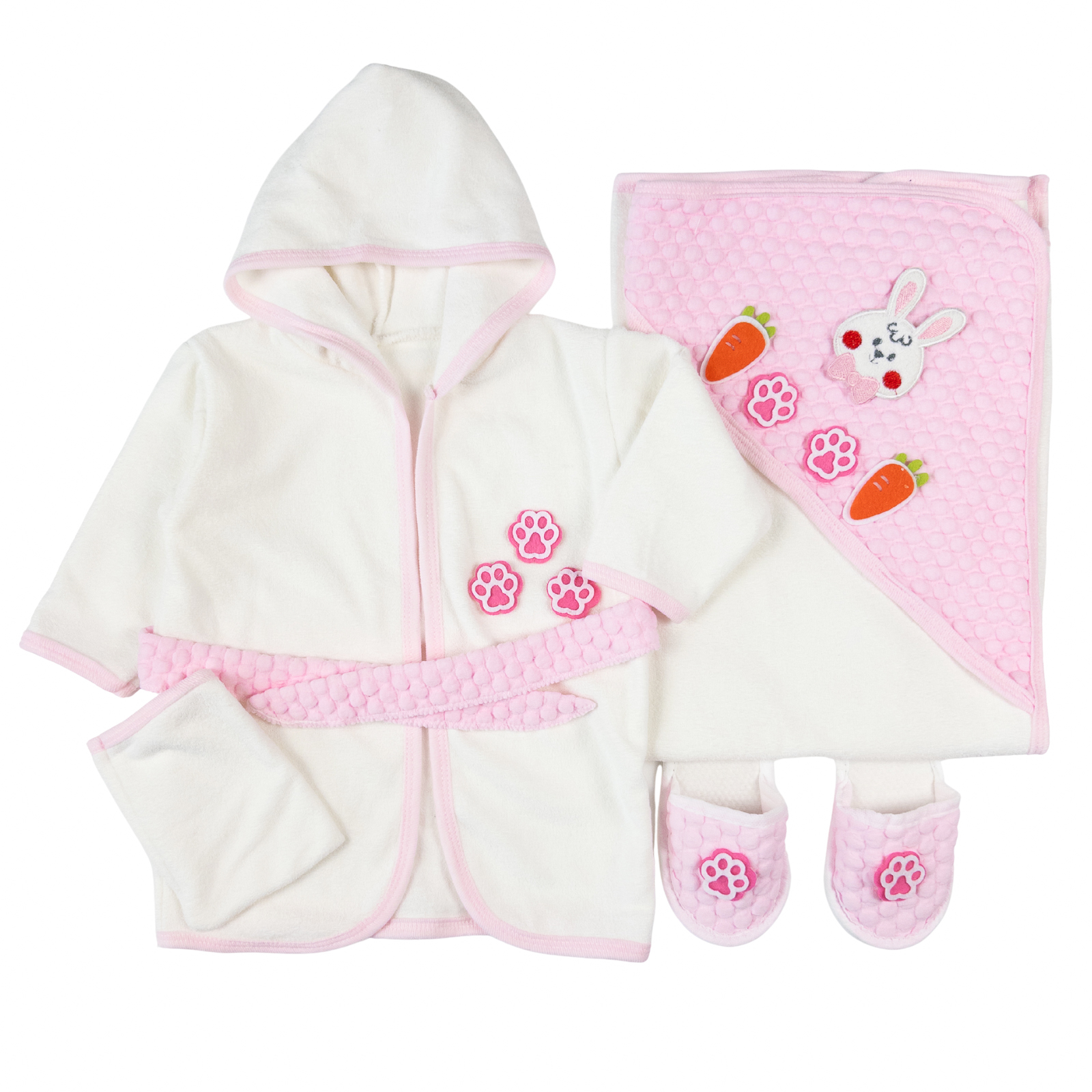Set Halat, Prosop si papucei de baie pentru bebelusi, model Iepuras roz, 0-1 an