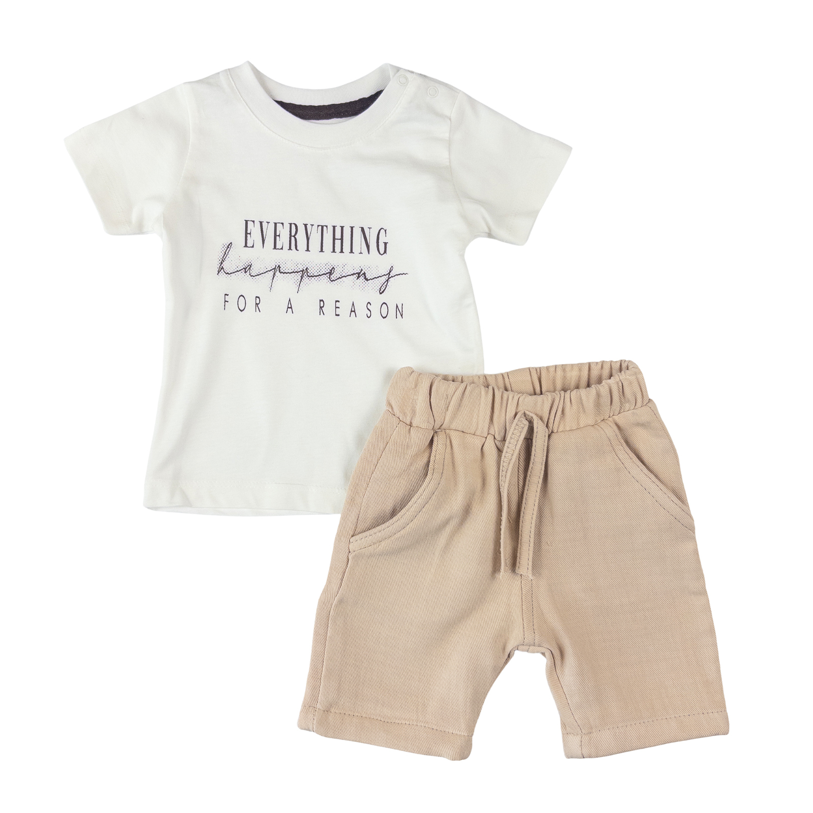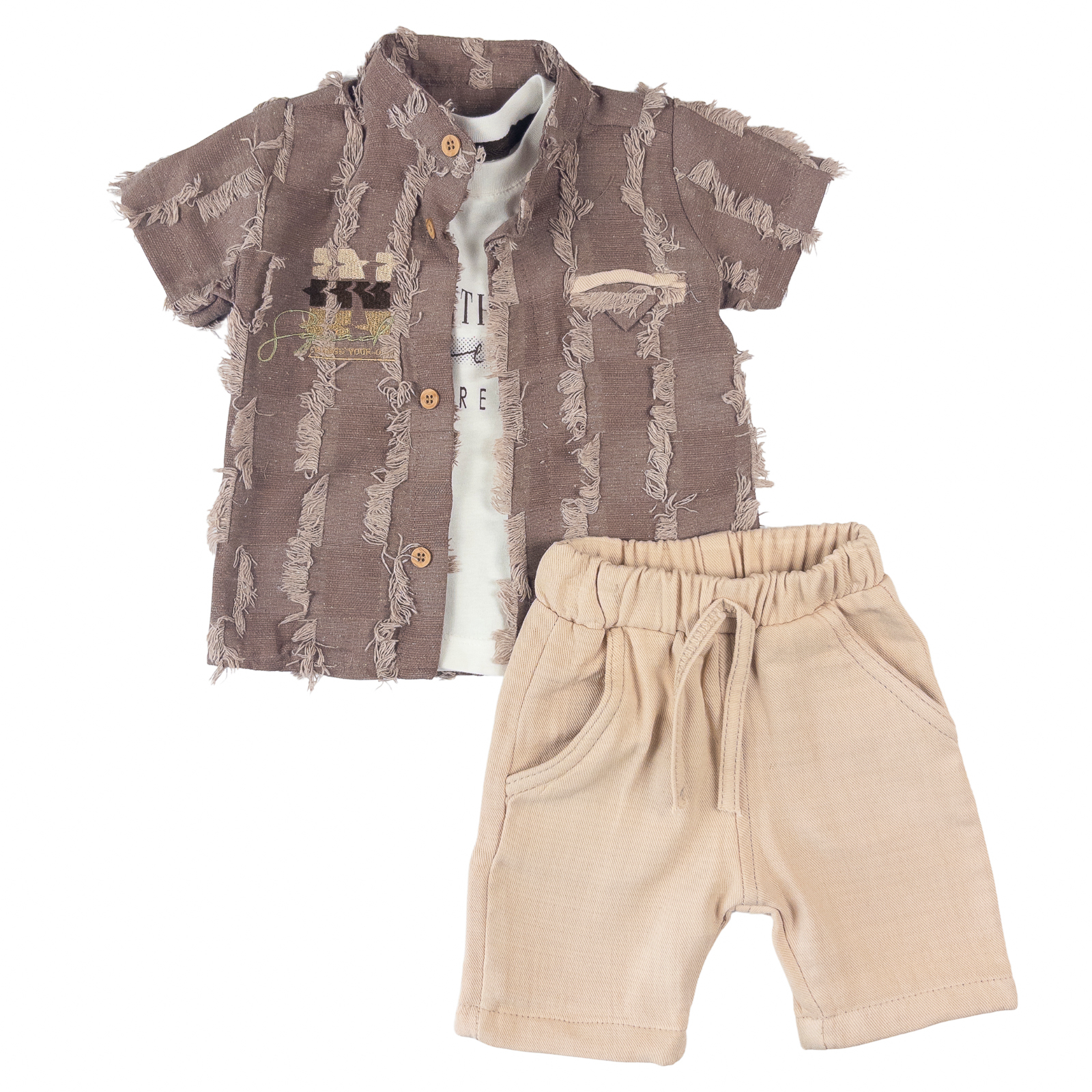 Setul include tot ce ai nevoie: o cămașă, un tricou alb cu imprimeu (perfect de purtat pe dedesubt, cu cămașa descheiată) și pantaloni scurți bej. Ești gata de plecare în doar câteva minute!