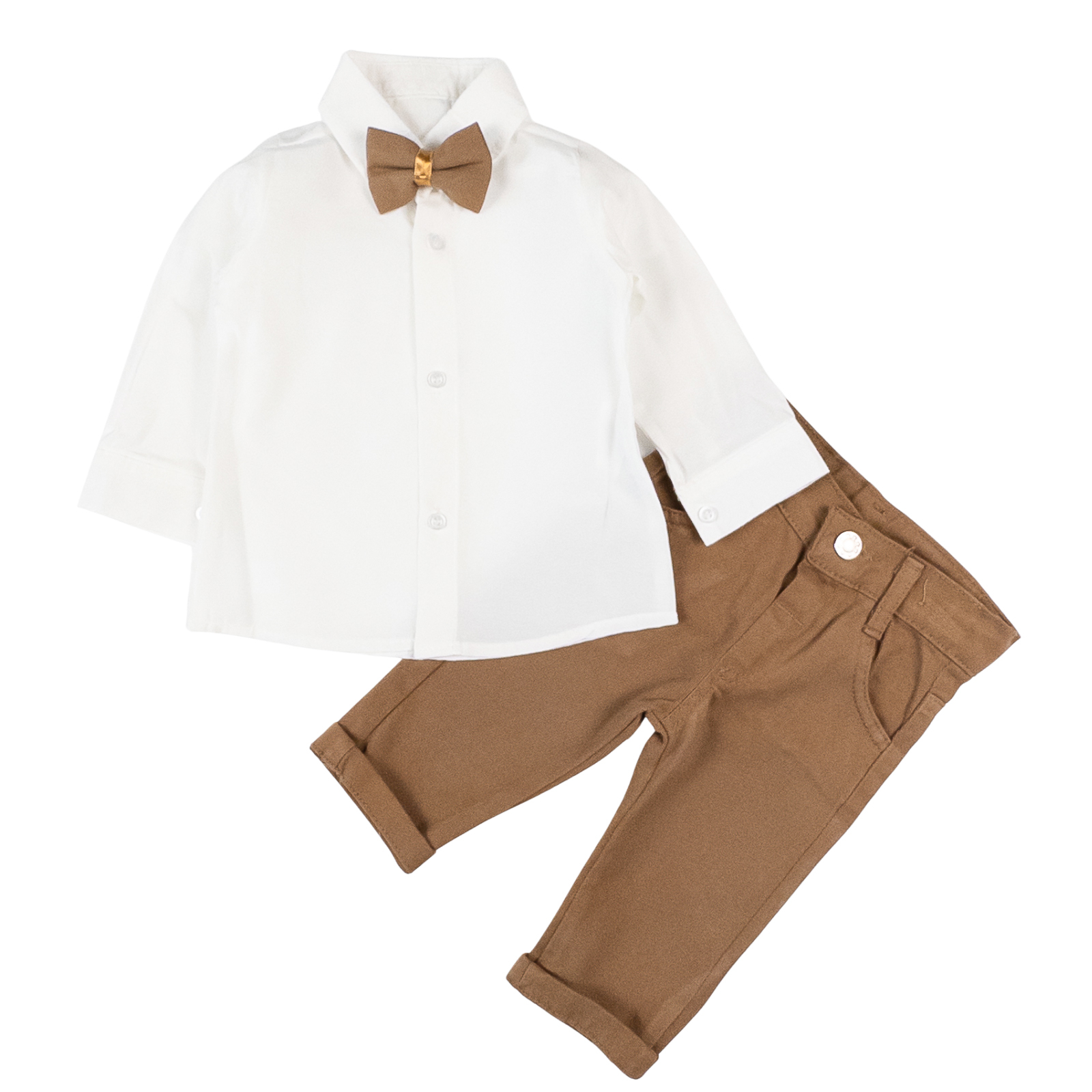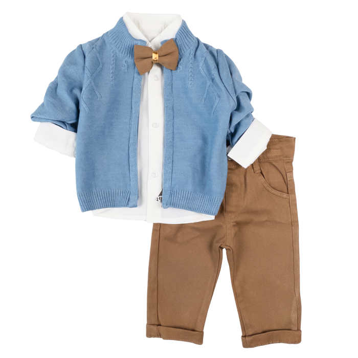 Compleu pentru bebelusi format din Pulover cu fermoar, Camasa cu papion detasabil si Pantalonasi tip Dokers