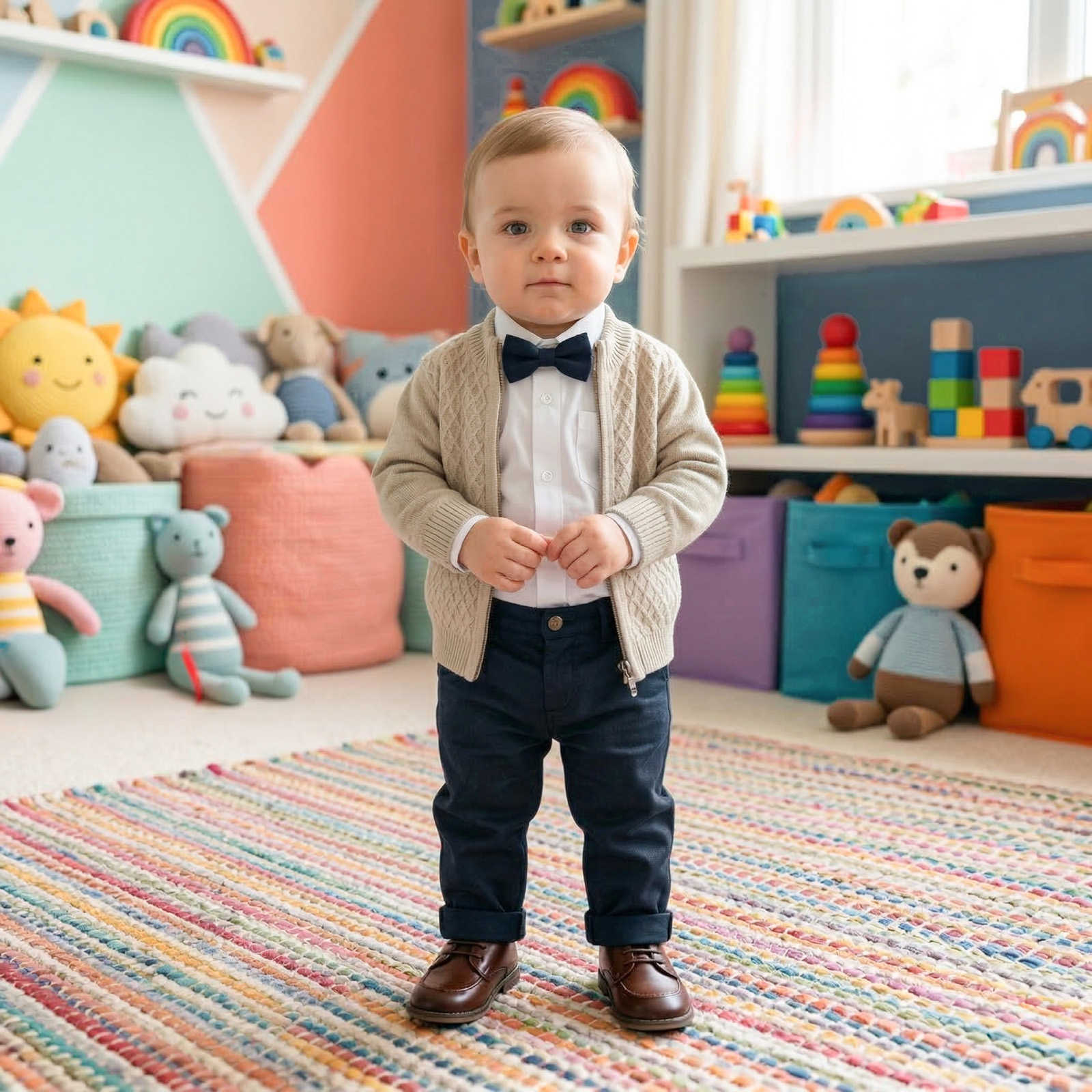 Compleu pentru bebelusi format din Pulover cu fermoar, Camasa cu papion detasabil si Pantalonasi tip Dokers