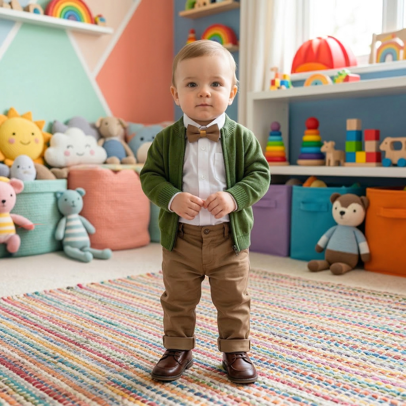 Compleu pentru bebelusi format din Pulover cu fermoar, Camasa cu papion detasabil si Pantalonasi tip Dokers