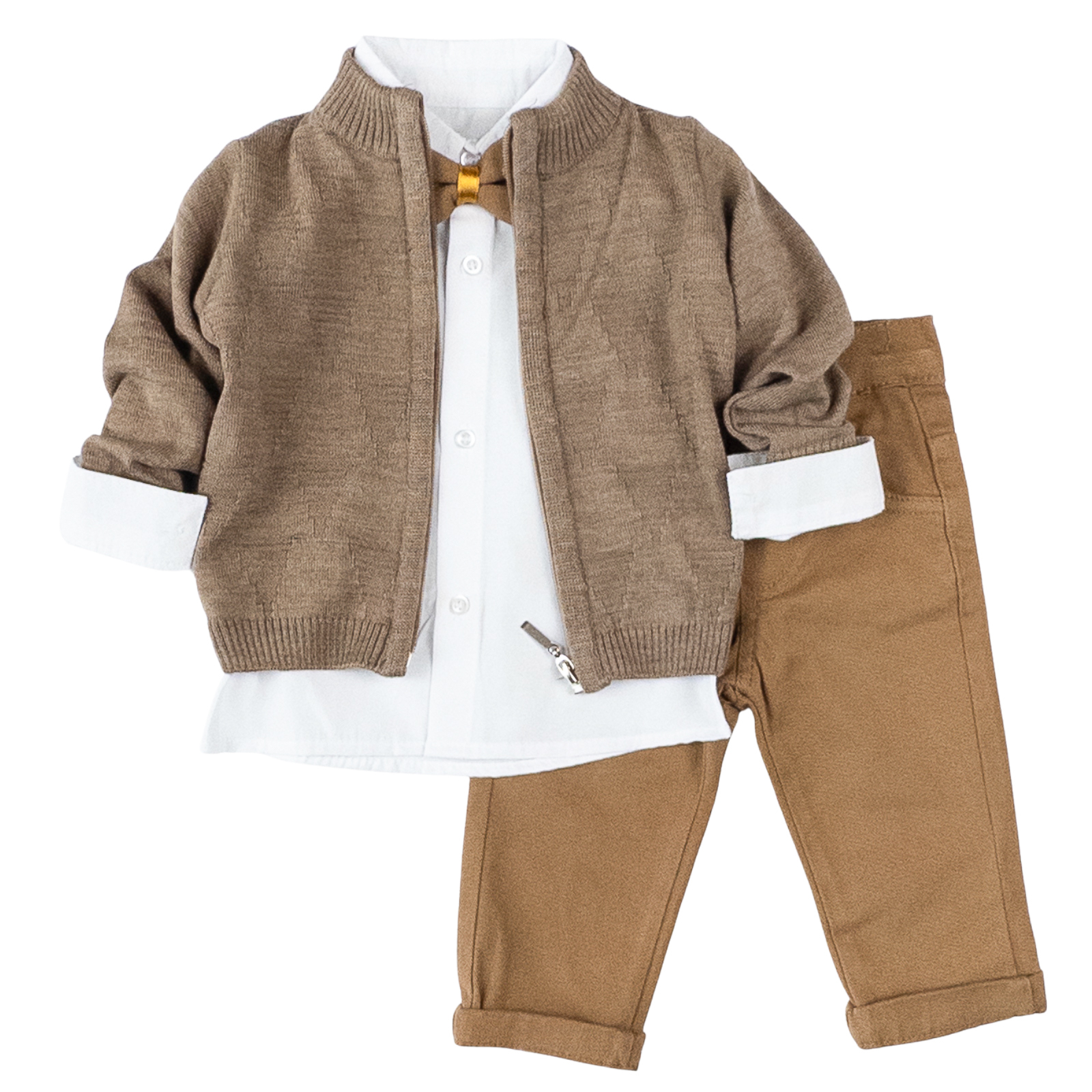 Compleu pentru bebelusi format din Pulover cu fermoar, Camasa cu papion detasabil si Pantalonasi tip Dokers