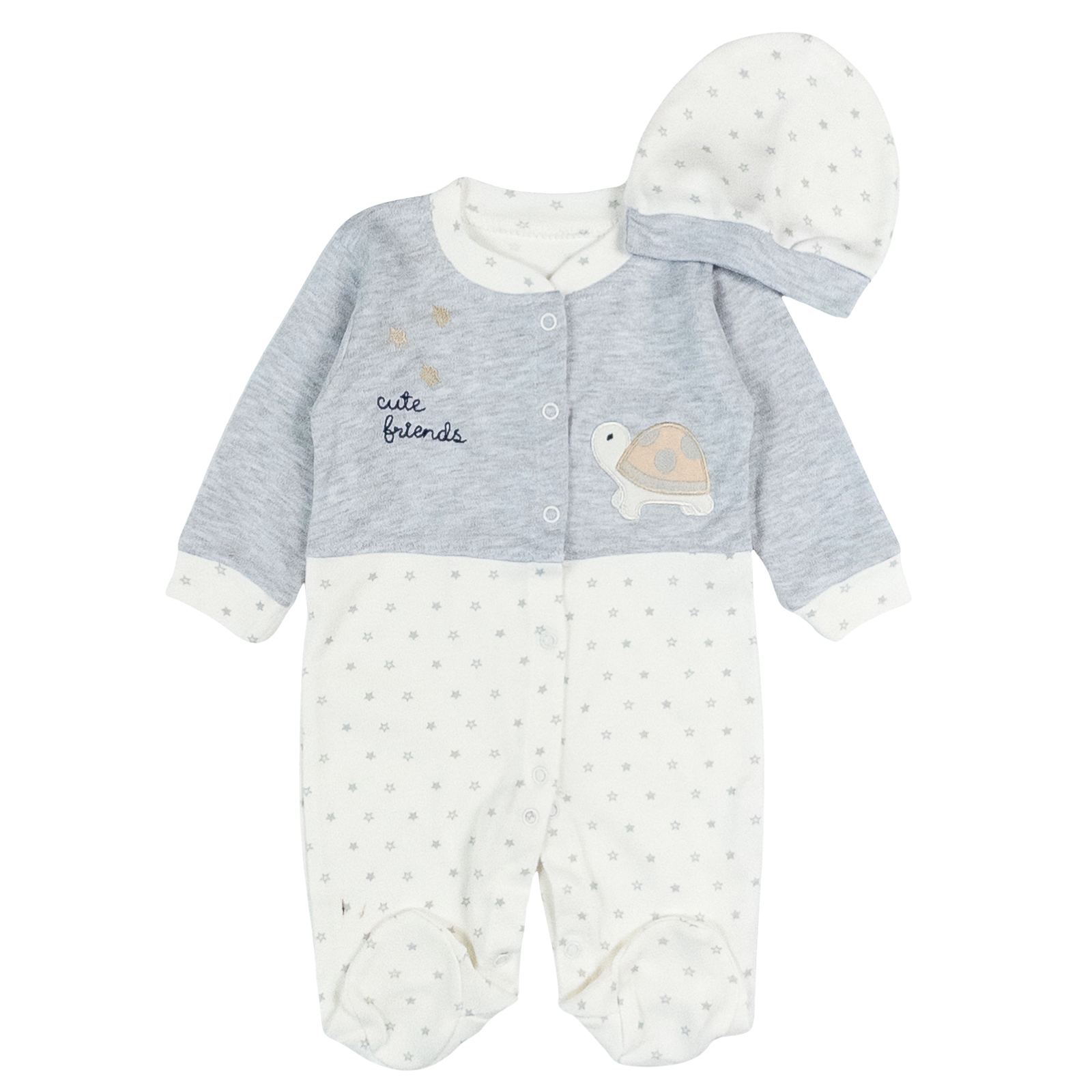 Salopeta si caciulita pentru bebelusi si nou nascuti, model cu Broscuta