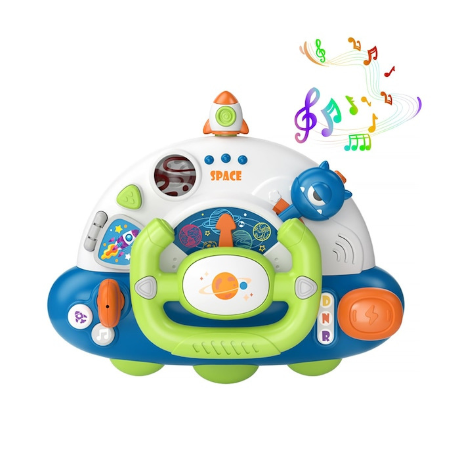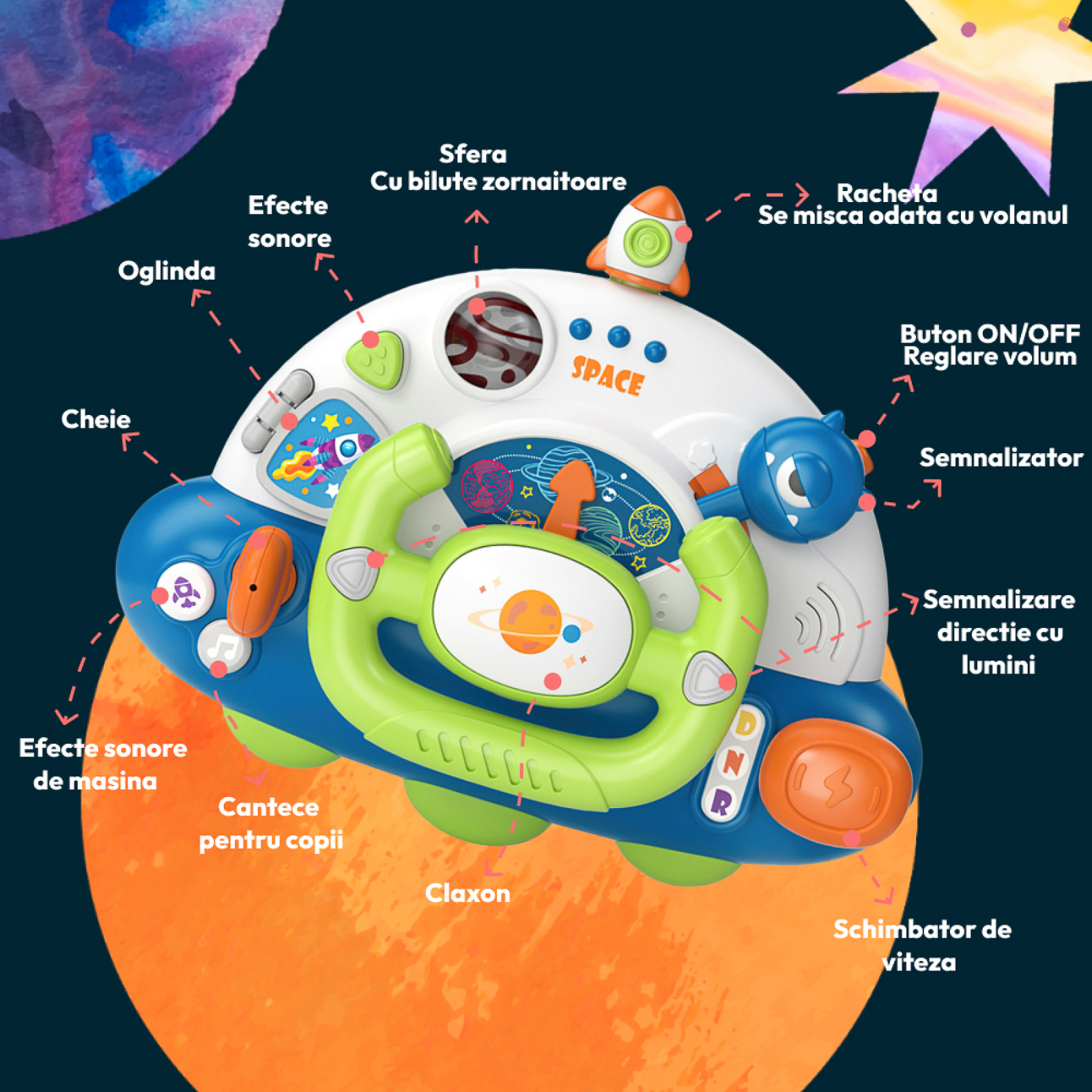 Jucărie interactivă, inspirată de o navă spațială, este perfectă pentru micii exploratori de peste 12 luni. Cu un design captivant, butoane interactive și sunete realiste, volanul stimulează imaginația și dezvoltarea cognitivă a celor mici. Caracteristici precum volanul rotativ, maneta de viteze, claxonul și oglinzile ajustabile încurajează jocul de rol, coordonarea mâna-ochi și învățarea timpurie a conceptelor de direcție și mișcare.