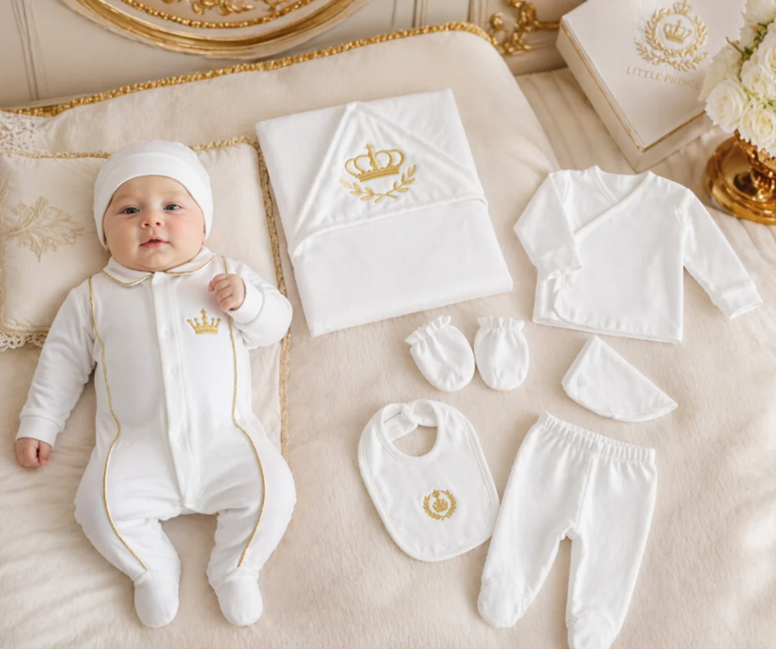 Transformă ziua externării din maternitate într-un moment de neuitat cu setul premium „Design Imperial”. Acest Set din 10 piese este definiția eleganței absolute: un alb pur, imaculat, pus superb în valoare de broderiile aurii sub formă de coroniță regală și de contururile fine. Este o alegere luxoasă, perfectă pentru primele fotografii ale bebelușului tău și un cadou cu adevărat impresionant.