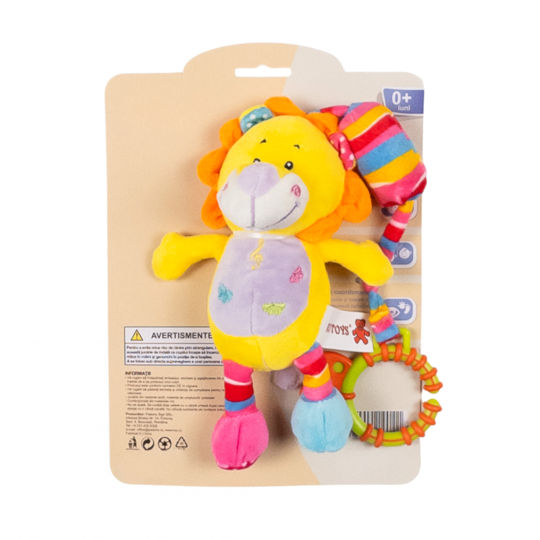 Jucărie interactiva model Leu din material textil, plăcute la atingere, ideale pentru dezvoltarea simțurilor vizual, auditiv și tactil ale bebelușului.