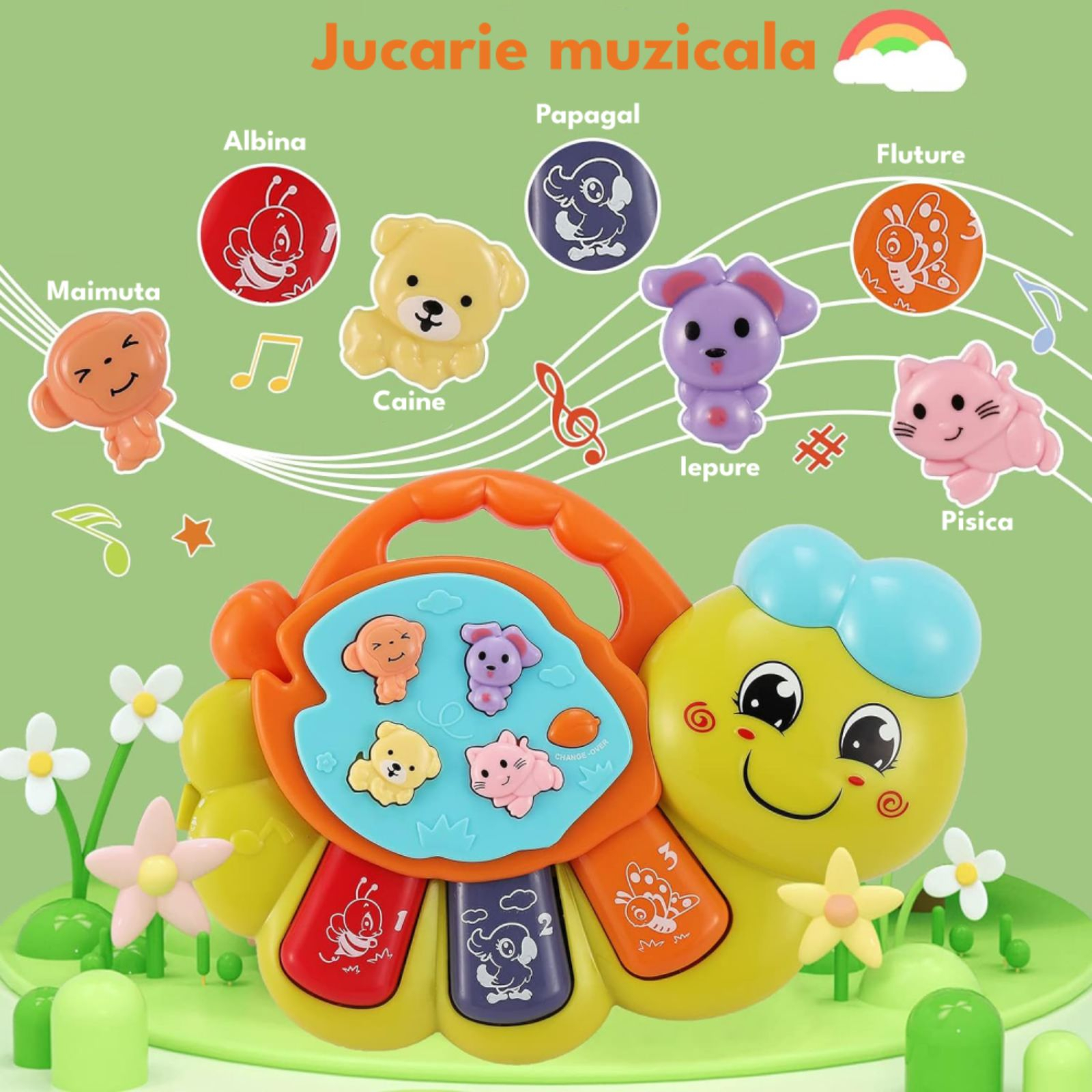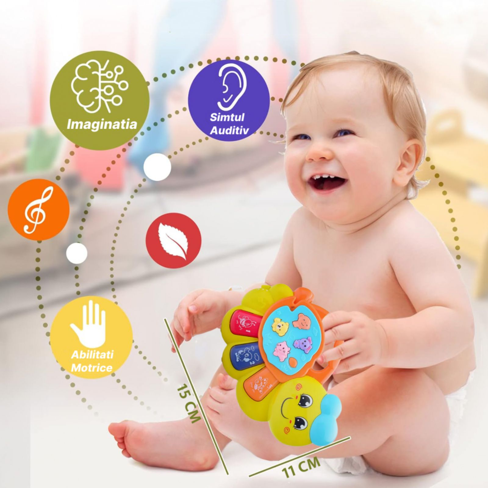 O jucarie muzicala cu lumini, conceputa pentru a avea dimensiunea perfecta pentru mainile mici ale unui copil mic si pentru primul contact cu teoria muzicii!