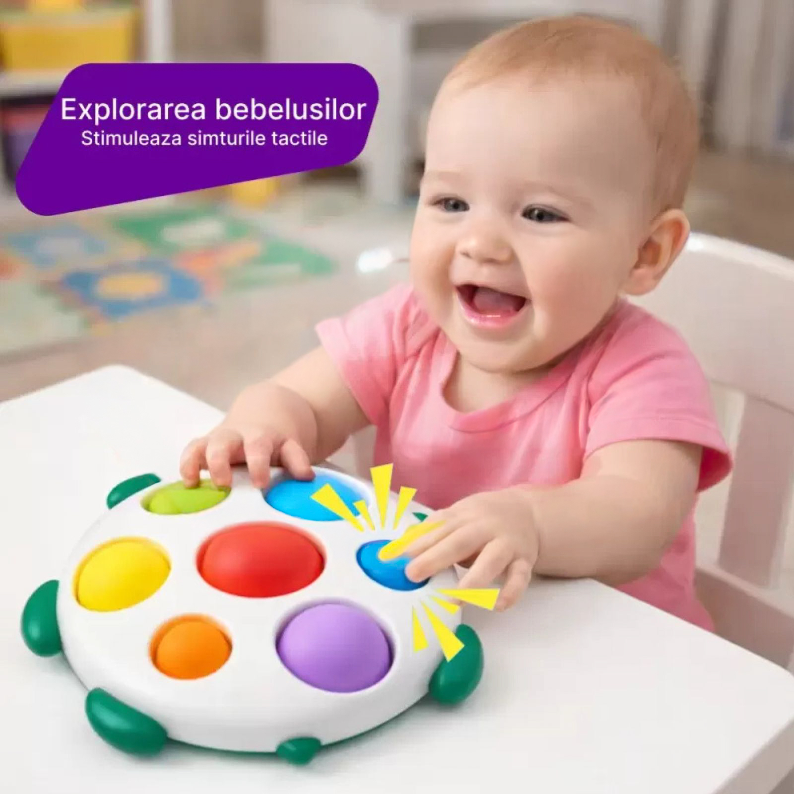 Pentru micutii de la 6 luni+, aceasta jucarie adorabila combina culorile vii si texturile pentru a oferi o experienta captivanta de joaca, vizual sustin invatarea si diferentierea culorilor, iar mecanismul de „push and pop” dezvolta rabdarea si intelegerea relatiei cauza-efect. Toate componentele respecta standardele europene de siguranta, fara substante periculoase sau margini taioase.