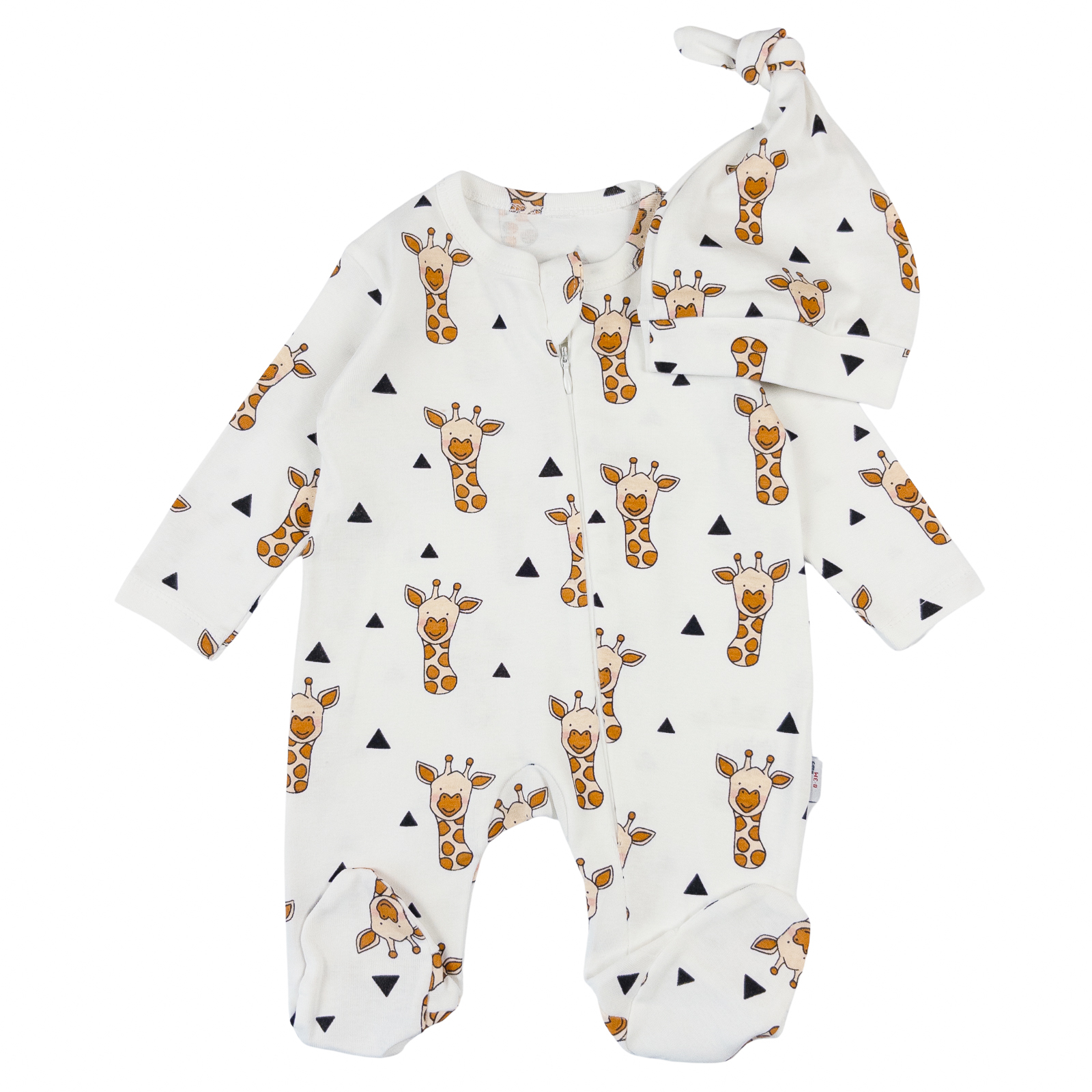 Salopetă cu Imprimeu Girafă și Căciuliță asortată, Bumbac Alb